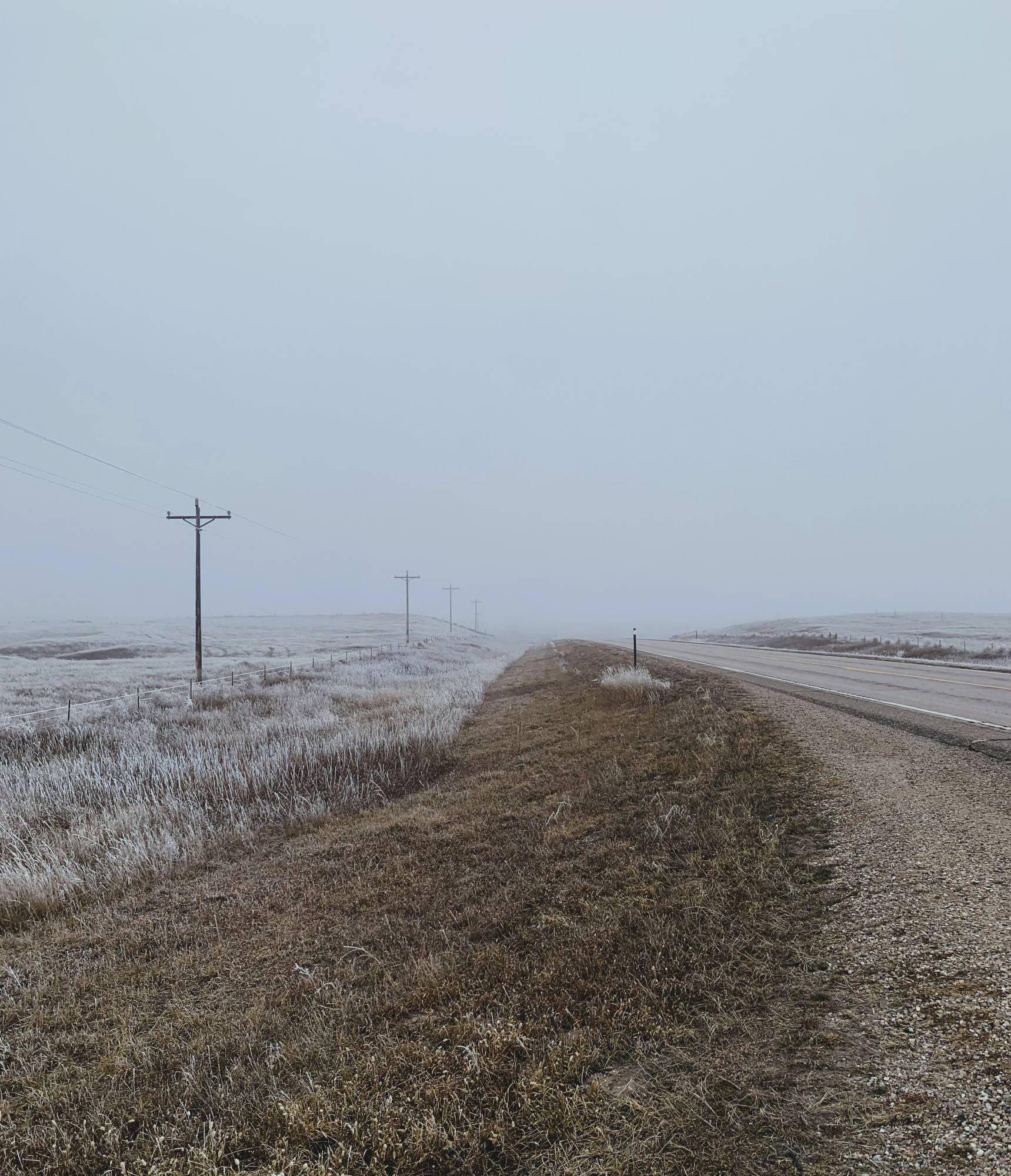The Badlands National Park was foggy and desolate. The Visitor’s Center was closed. We weren’t sure where to go so we stopped by the side of the road to regroup. I stepped out of the Jeep to breathe 19°F air. Coming from Florida, it’s a rare treat to shock my lungs and nostrils this way. I took a pic.